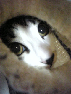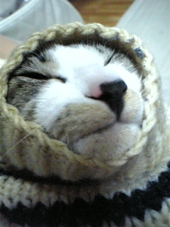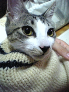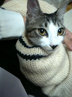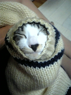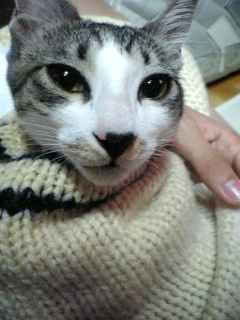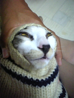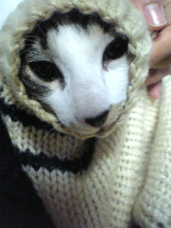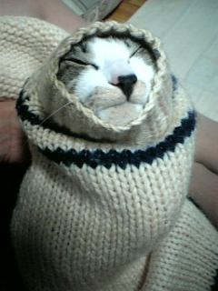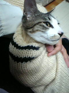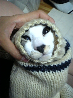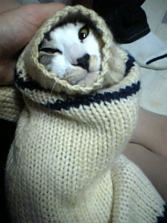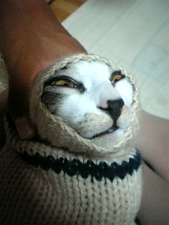 ニットカーデの袖の中に入ったら抜け出せなくなっておもちゃになってしまったジンくん おじいちゃんになっちゃったよ〜!!(笑) 弟が引っ張りました(酷い 目が必死だ!!